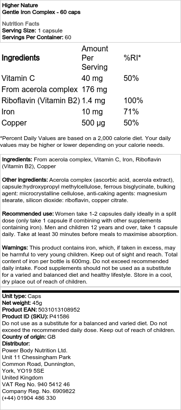 Formulato con bisglicinato di ferro per il massimo assorbimento e comfort digestivo, questo delicato complesso di ferro è il tonico perfetto per ripristinare l’energia se i suoi livelli sono bassi. Ha aggiunto rame e vitamina B2, entrambi necessari per il metabolismo del ferro nel corpo, e vitamina C naturale dal frutto dell’acerola che aiuta l’assorbimento del ferro nell’intestino. Bassi livelli di ferro possono essere dovuti a bassi livelli nella dieta, come essere vegetariani o vegani, o perché il corpo ha un bisogno maggiore, ad esempio durante la gravidanza. Le donne in pre-menopausa hanno spesso un maggior bisogno di ferro perché viene perso durante il ciclo mensile. Si perde più ferro se le mestruazioni sono pesanti, il che a sua volta può portare ad un ulteriore impoverimento, lasciando una sensazione di stanchezza. Il ferro è necessario affinché i globuli rossi siano in grado di fornire ossigeno alle sue cellule, così come un sistema immunitario sano e la funzione cerebrale. Se la sua pelle è pallida, si sente più stanca del normale o senza fiato dopo un esercizio leggero potrebbe essere a corto di ferro.